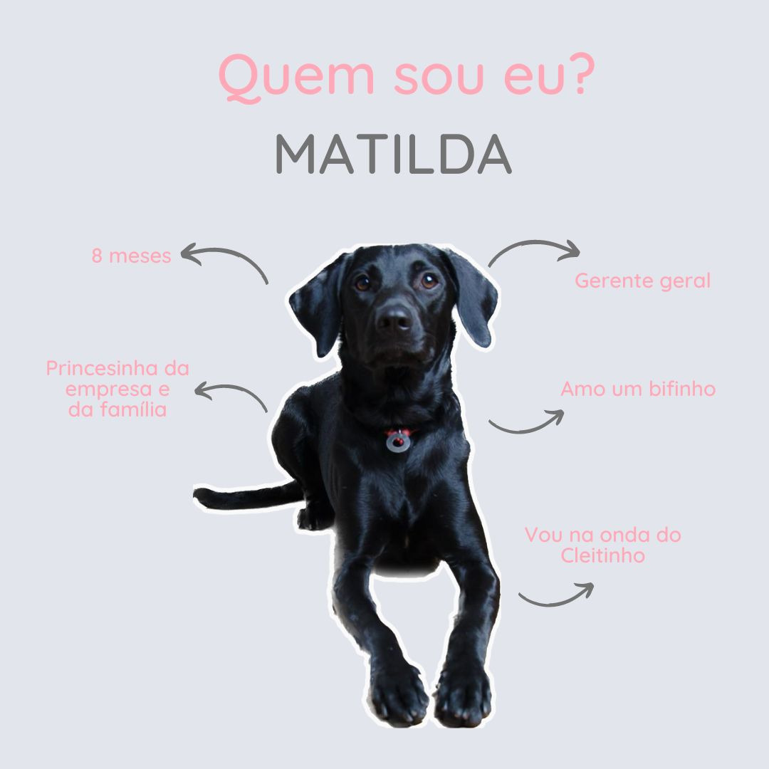 Ela é filhote de um casal de cachorros de amigos queridos. Um Golden Retriever e uma vira-latinha bege. Na mesma hora que eu soube que a cachorra estava prenha, já disse pra minha amiga: vou ficar com uma! Na minha cabeça, seria minha nova labralata, igualzinha a Pink. Um dia antes de seu nascimento, ainda brinquei com meu marido: "Imagina se vem pretinha? Completa nossa turma de pretinhos"! Mas achava que seria impossível. Ah, e detalhe, meu marido continuava com os sonoros "Ahans" dele, dizendo não o tempo todo. Começaram a nascer os filhotes... 1, 2, 3... 9 nenéns PRETOS, TODOS PRETOS! Se eu já tinha certeza que iria adotá-la, aí é que tudo ficou mais certo ainda! Chegou em casa tarde da noite e só mostrei ela pra Cleitinho, que rosnou e pro Rex, que nem deu bola e deve ter pensado: Senhor, mais uma? kkkkk... Dormi trancada com ela no outro quarto. A noite toda dormiu no meu pescoço. Foi um reencontro! E como esperei por esse reencontro! No dia seguinte levantamos, coloquei ela no chão e deixei que se virassem. Em menos de duas horas ela e o Cleitinho já eram melhores amigos. O Rex devia continuar com o mesmo pensamento: Por quê, Senhor? kkkkk. Ela é doce, carinhosa e amorosa. Faz festa pra gente e pro Rex se fica 5 minutos sem nos ver. Mas é A festa! Já com o Cleitinho não tem tempo de sentir saudade, porque os dois não se desgrudam um minuto sequer no dia e brincam o tempo todo, nos tirando altas risadas. Costumo dizer que eles são gêmeos do nado sincronizado. Fazem tudo igual, tudo! Ela é a princesinha da casa. No estúdio está sempre olhando tudo o que faço, como se estivesse gerenciando cada detalhe, por isso ganhou o cargo de gerente geral.